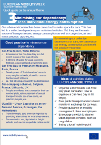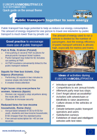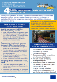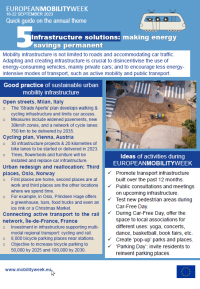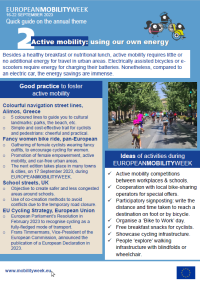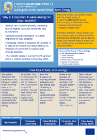 The following ‘Quick Guide’ factsheets are divided into five topical areas - 1) Public Transport, 2) Active Mobility, 3) Minimising Car Dependency, 4) Mobility Management and 5) Infrastructure Solutions - and provide a clear explanation of the 2023 theme - Save Energy - and how to communicate this as part of your campaign.
